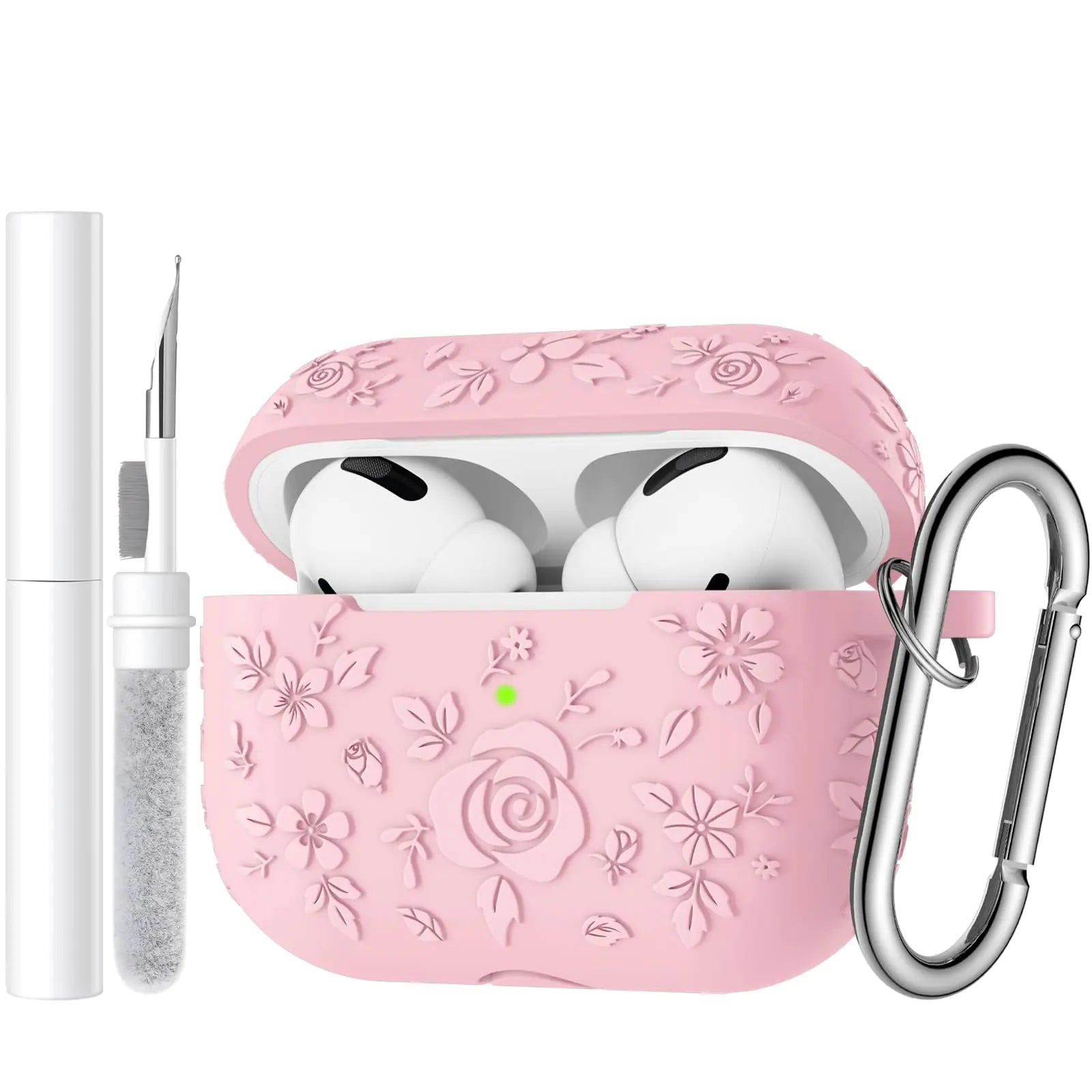 Medical Grade Silicone AirPods Pro Case With Floral Design Front LED Visible Baby Pink Cleaning Kit Made In Japan